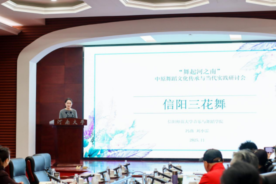 2025年11月14日至16日,由河南省舞蹈家协会、河南大学音乐学院联合主办的“舞起河之南——中原舞蹈文化传承与当代实践研讨会”在河南大学明伦校区召开。本次研讨会聚焦中原舞蹈文化的保护传承与当代创新,来自国内外多所高校、艺术院团及研究机构的专家学者齐聚开封,共同探讨中原舞蹈文化的历史脉络、艺术特色与当代创新路径。应大会邀请,我校永利集团3044官网欢迎您舞蹈教研室“信阳三花舞”科研团队参加会议,团队主创成员刘小雷、冯燕、陈依雯、李梦婷代表学校出席研讨与展示交流。